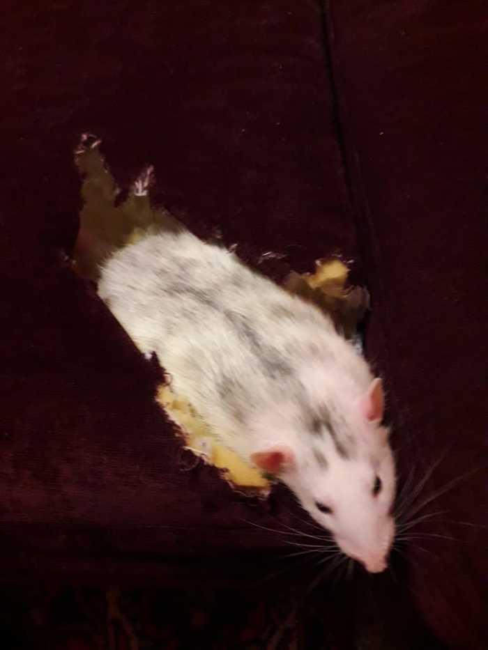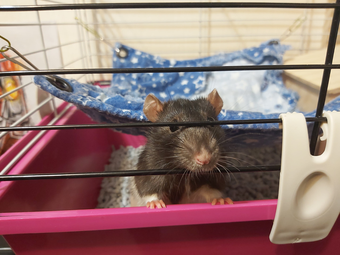 Опыт с применением перчатки не удался — на них он бросается моментально. Теперь накрываю Гоголя полотенцем и достаю из клетки этакую крысиную шаверму. Пальцы не покусаны, крыса не в панике, сидит укутанный, зубами шуршит, глаза пучит, гладиться даёт. А там уже и на руки выползает.