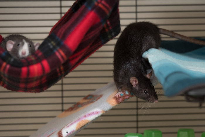 Вафелька более спокойная, в основном любит поесть, поспать, что-нибудь погрызть или наблюдать за Пискуном. А тот больше любит побегать в колесе или просто по своим владениям)