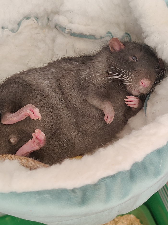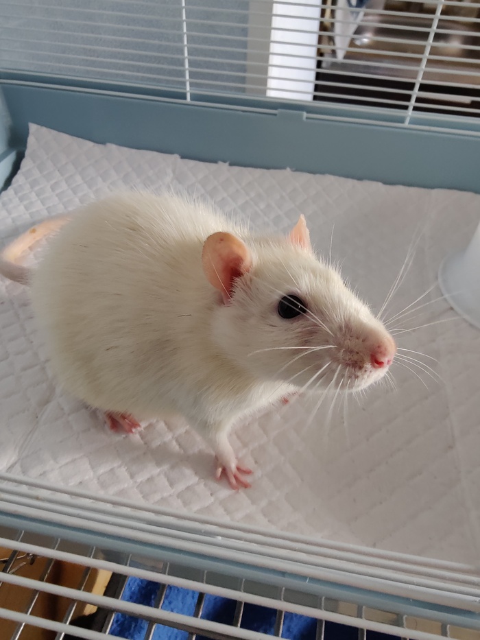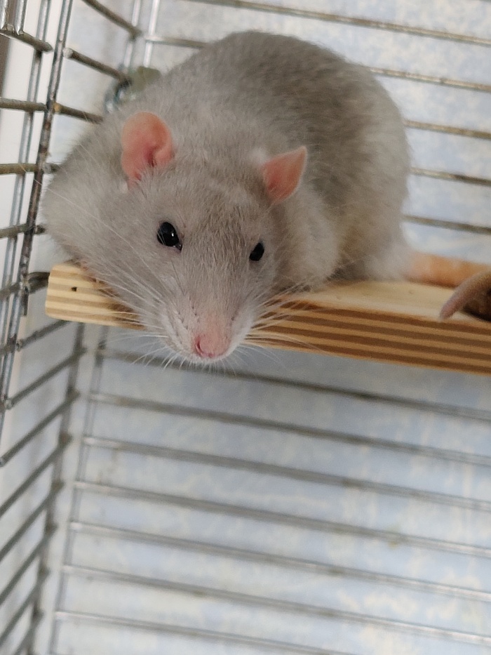 Я решила его забрать к себе, ему было уже 2 годика, с аллергией от опилок в виде ранок на шее. Звали его ранее Суетолог, но у нас он стал Дед Борис. Пробыл у нас неделю и отправился гулять по радуге так и не познакомившись с другими крысюками :)
