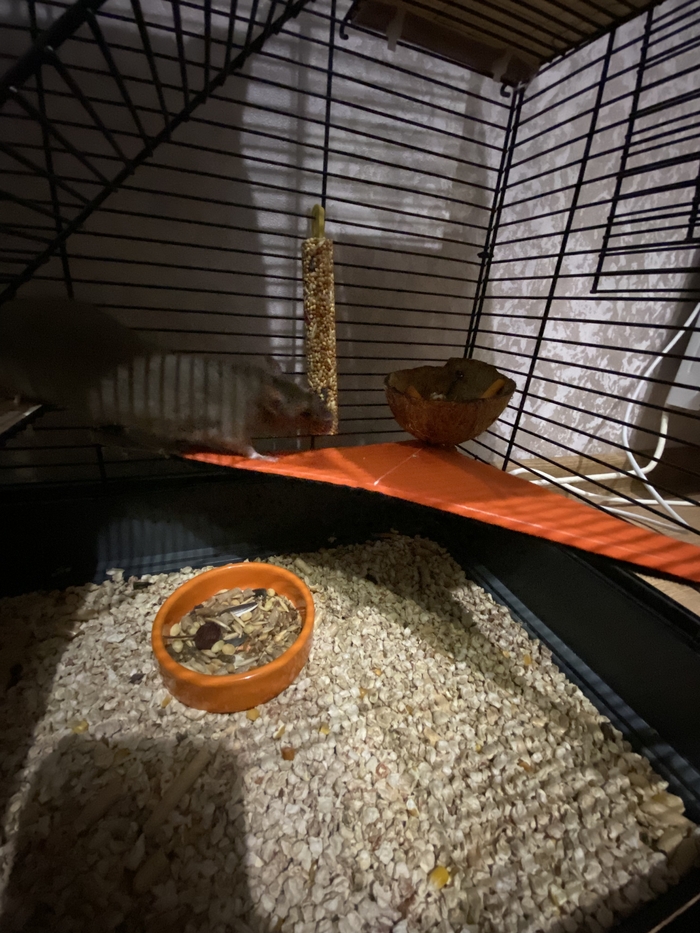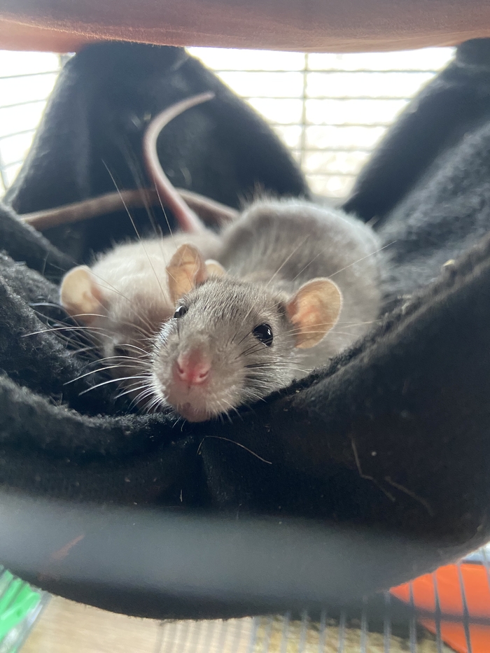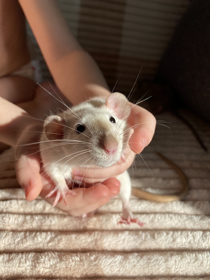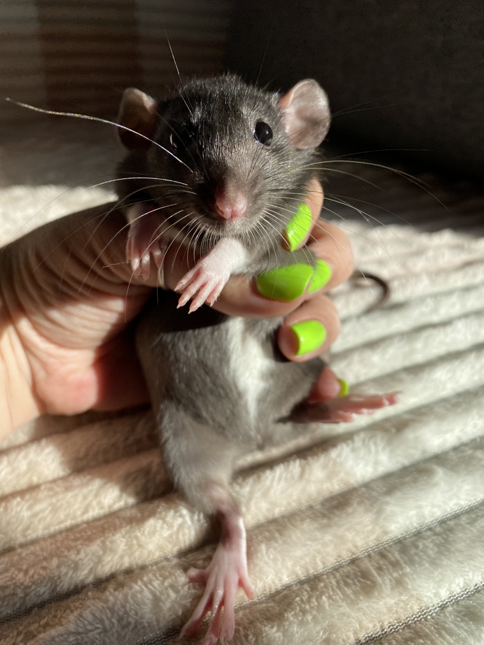 Это Лея. Обычно она почти спокойная девочка, которую можно даже держать на руках некоторое время и гладить животик. Но когда настает время прогулки, она превращается в крысиного Сэма Фишера - постоянно прячется и пытается попасть в закрытые для нее места, а стоит ей спалиться, как она паникует, начинает орать крысиным матом и немедленно убегает