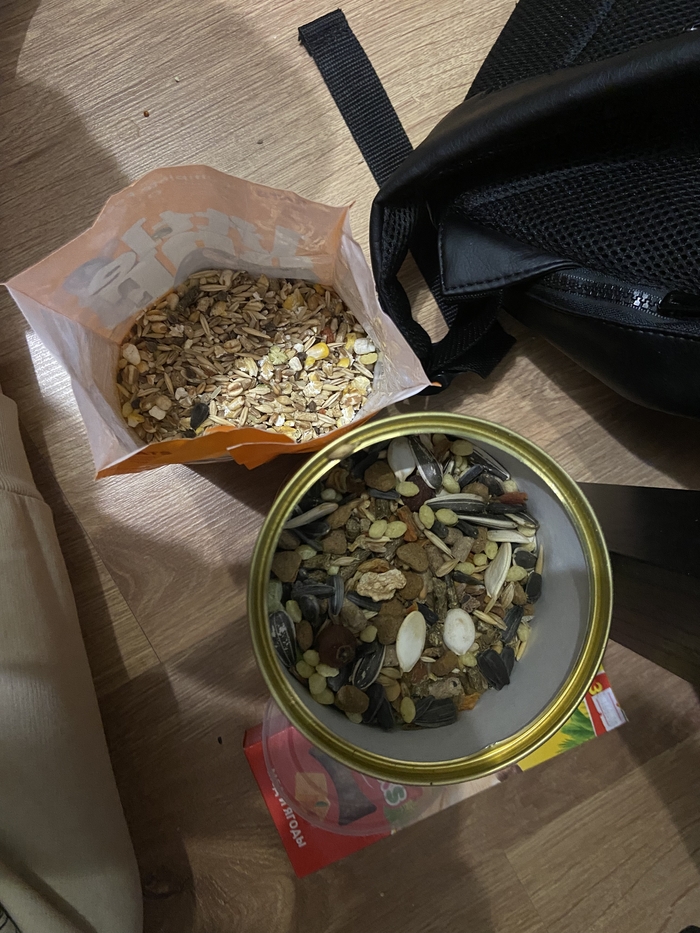 На днях кстати очень торопилась с работы домой, забежала купить корм (совсем дома закончился в тот день, днём из головы вылетело), не было Вака Биосферы (его беру и по графику дополняю должным образом рацион: овощи, фрукты, кисломолочка и ещё Цамакс даю), пришлось взять что был, а был только Litl One и Боже… Какой это шлак, а не корм. Мне пацанам было его стыдно давать, настолько стыдно, что утром рано погнала покупать Вака. Одна пыль и ошметки с хлопьями какими-то в этом One, прям руки приходилось вытрушивать, полно пылюки было! Это в принципе такой корм, или мне просто так повезло? 🥲 Знаю что Вака не из супер каких-то классных, но он в 100500 раз лучше чем этот One. По крайней мере лучше чем тот, который я купила. 🥲🥲🥲 На фото хорошо разницу видно. 🥲 Но кстати и One приспособила - высыпала воробушкам.) 😅