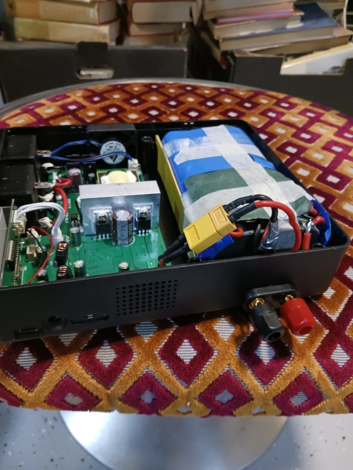 Решил найти другое решение зарядки и нашёл-намного проще и надёжнее заряжать непосредственно на BMS аккумулятора.Функции 220 вольт и 5 вольт усб работают ,дисплей так же показывает полностью заряженный агрегат. И ещё самое важное к этим клеммам можно установить дополнительно хоть 5 сборок на 16 вольт .Может кому пригодится такое решение.