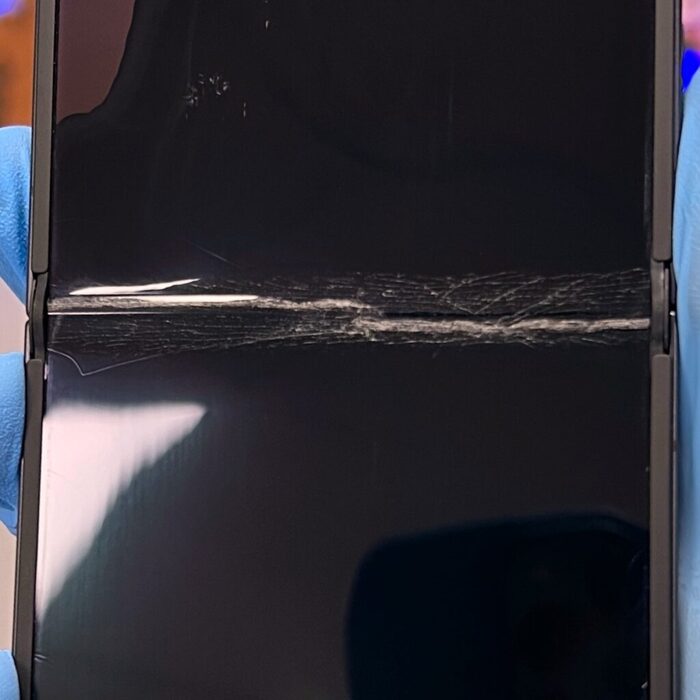 Дисплей разорвало осколками гибкого стекла на сгибе — классика для всех раскладушек)