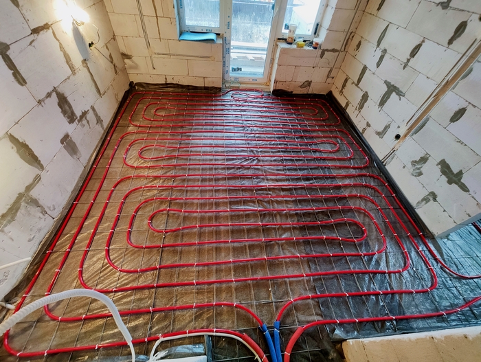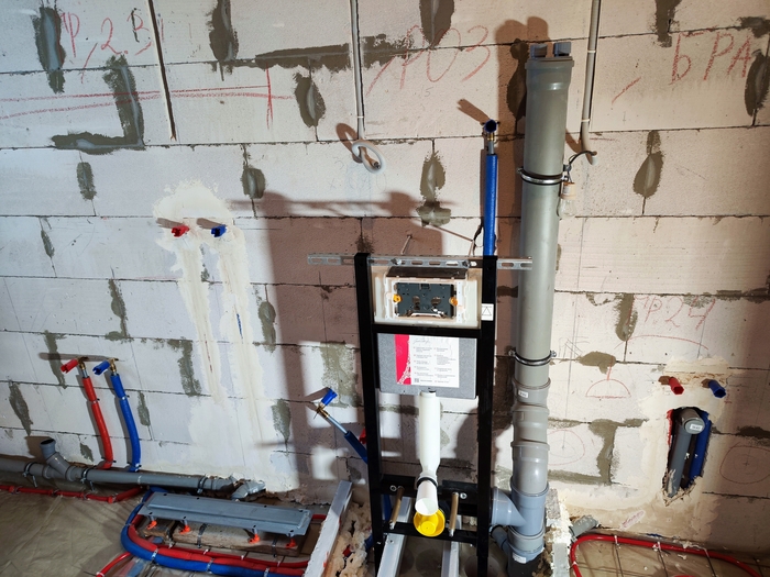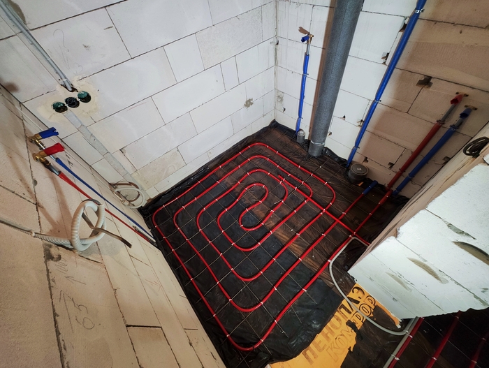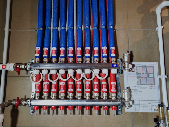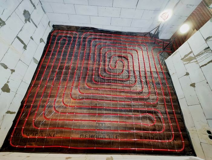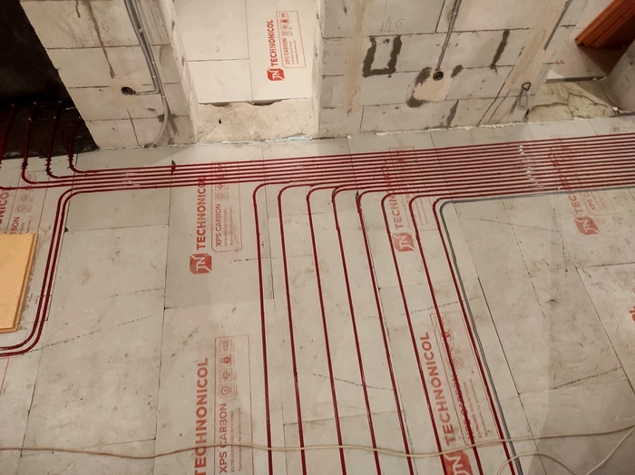 Выполнен монтаж теплых полов и водоснабжения с канализацией в доме площадью 180кв.м. Котельная будет во второй части.
