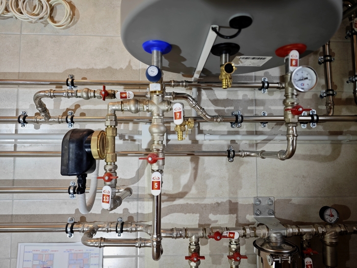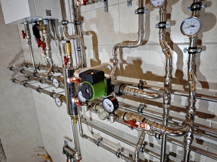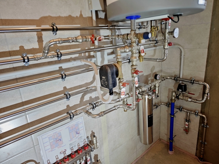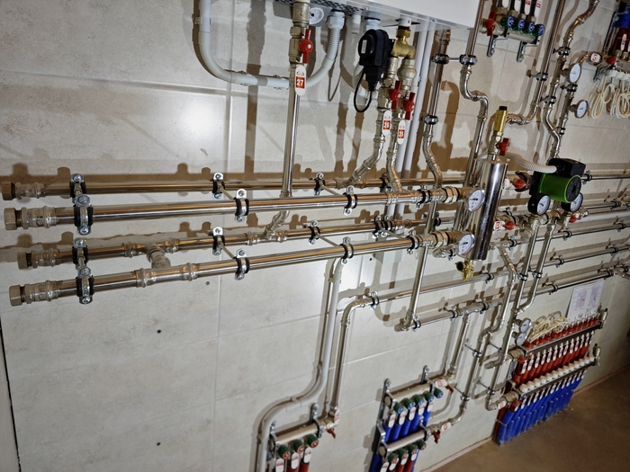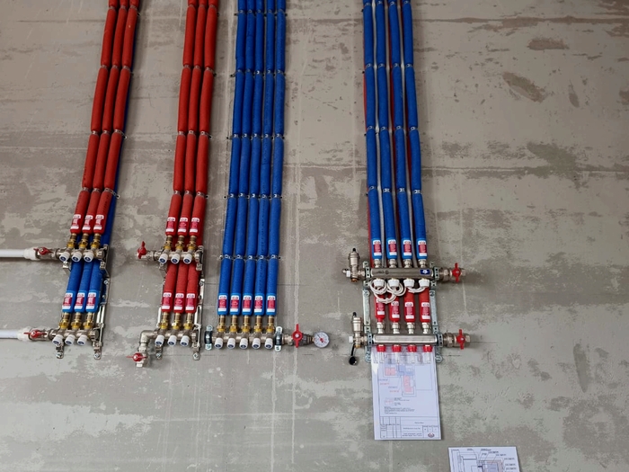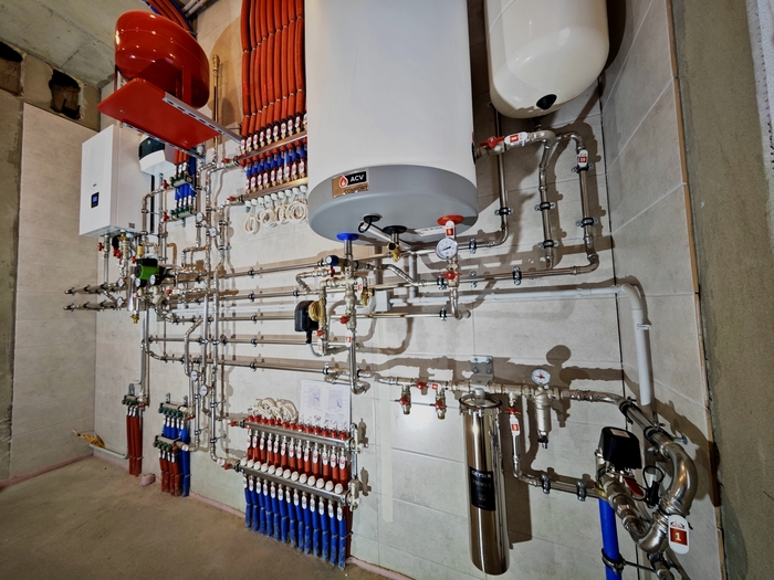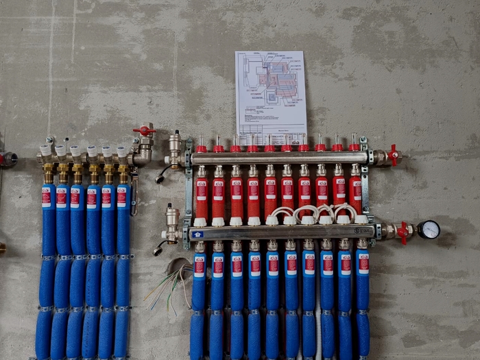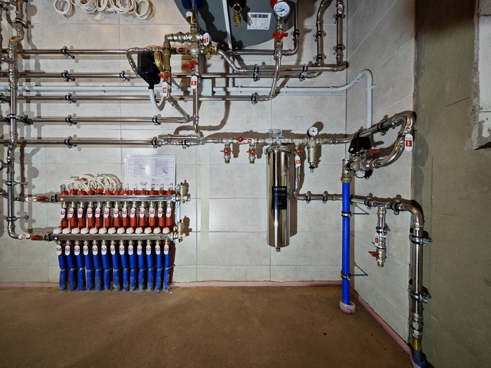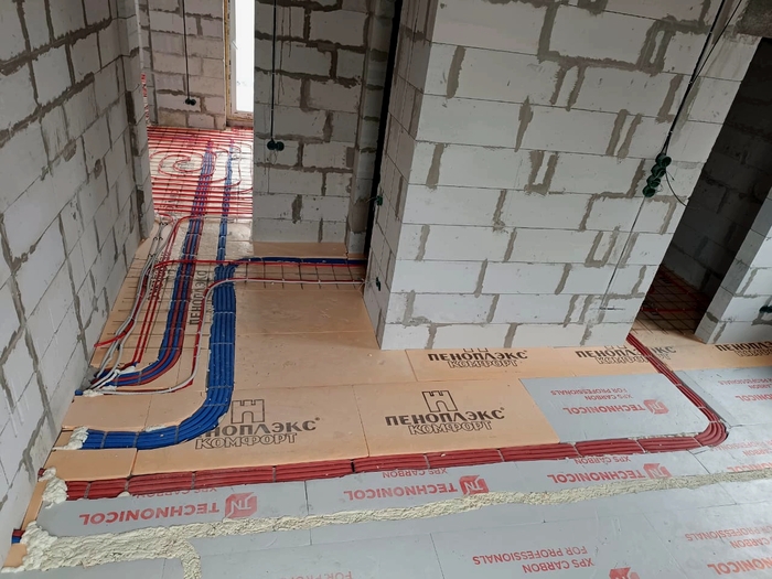 Выполнен монтаж теплых полов и водоснабжения с канализацией в двухэтажном доме площадью 238кв.м. Котельная будет во второй части.