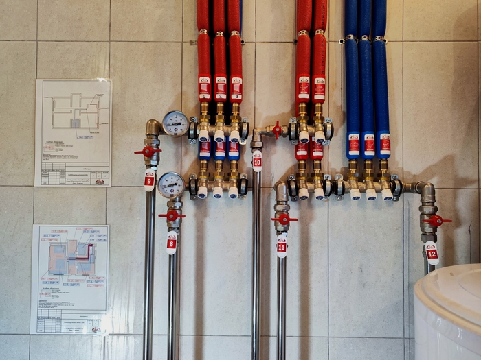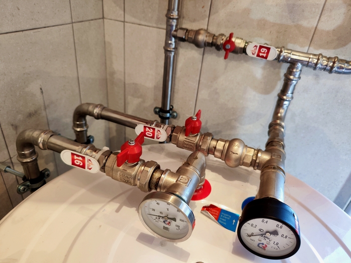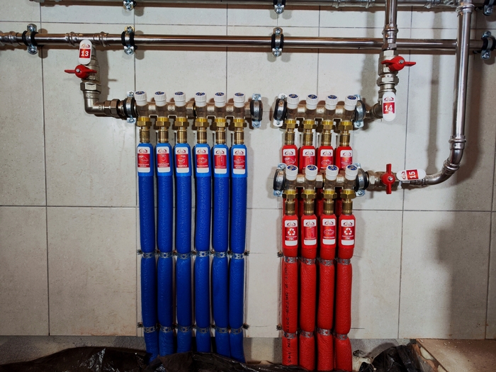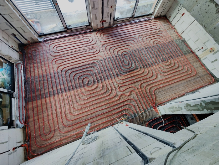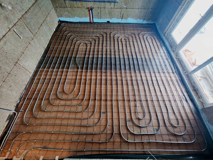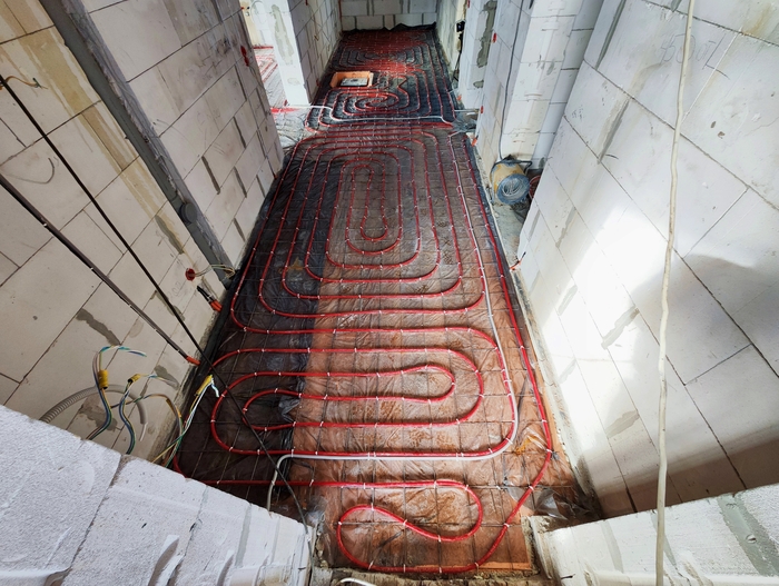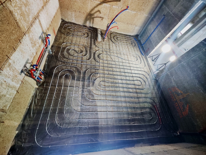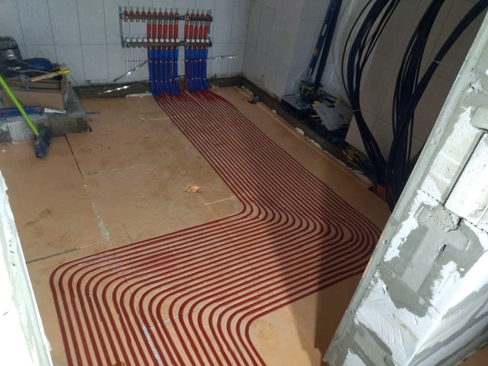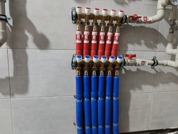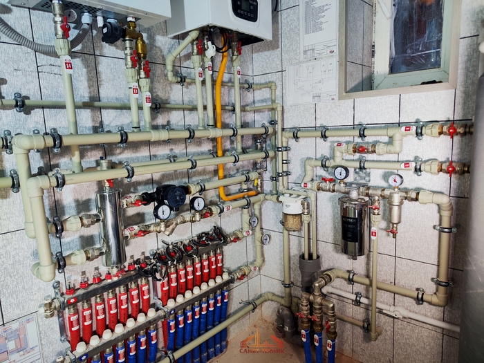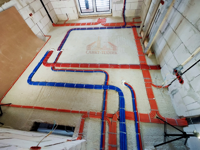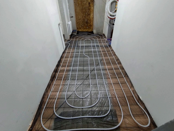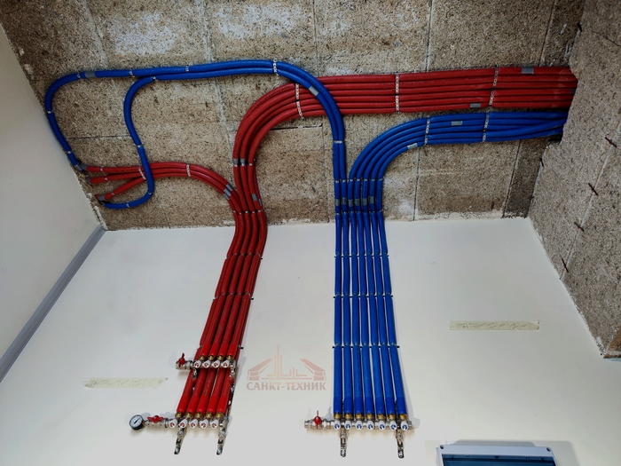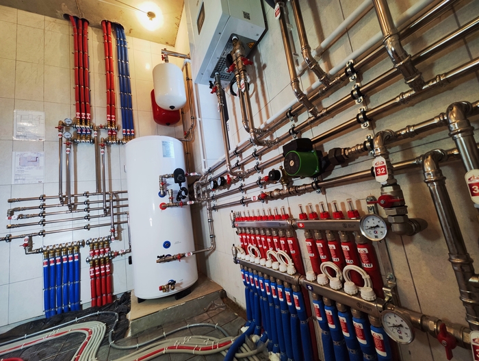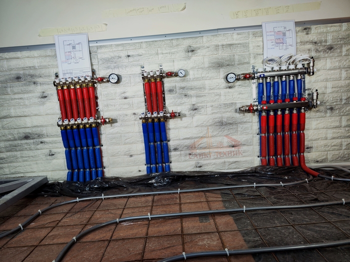 Отопление с котельной смонтировали за 10 дней. Это внутренние сети по теплым полам и радиаторам. Котельную выложу позже, когда сам доеду и сфотографирую. Эти фото делал Слава. Поэтому нет фото дома, - он его забыл бахнуть.