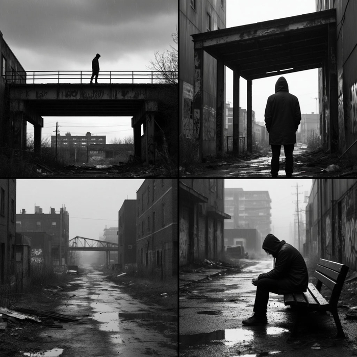 Это серия сгенерированных изображений, где цвет сознательно исключен как элемент, а вся смысловая и эмоциональная нагрузка ложится на: