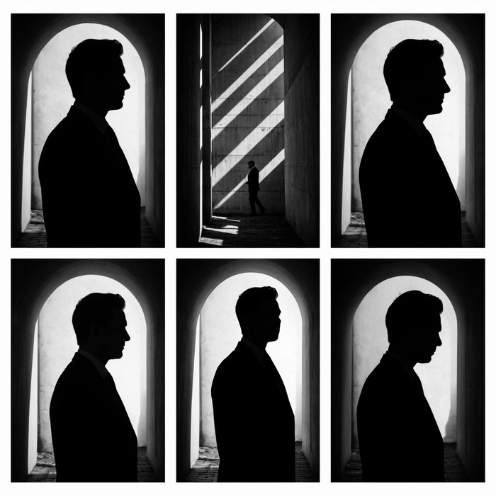Create a visual moodboard for a black and white photography series with the theme "Shadows and Silhouettes". Include references to high-contrast portraits, architectural shadows, minimalist compositions, and examples of dramatic lighting from classic cinema.