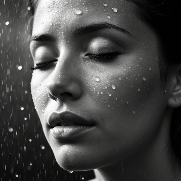 Extreme close-up portrait of a woman's face, eyes closed, water droplets on skin (rain or sweat). Soft, diffused light from above creates a chiaroscuro effect, highlighting cheekbones and lips while leaving deep shadows. Monochrome, sensual, textured skin, hyper-realistic, black and white.