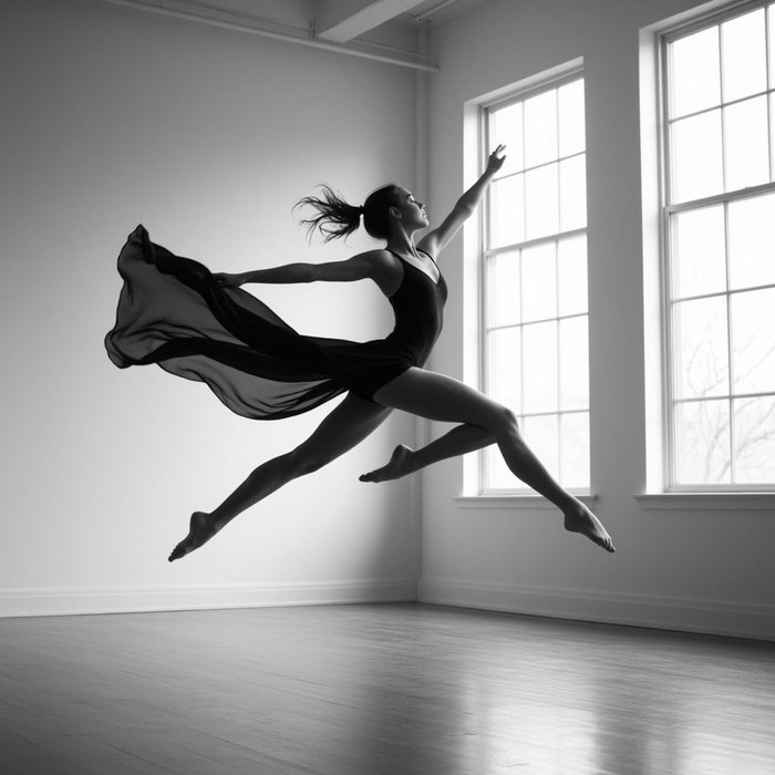 A single still frame from a black and white video: A dancer mid-leap in a sparse studio, fabric of the dress flowing in motion. Stark, clean background, light from a large window freezing the movement. High contrast, artistic, graceful.