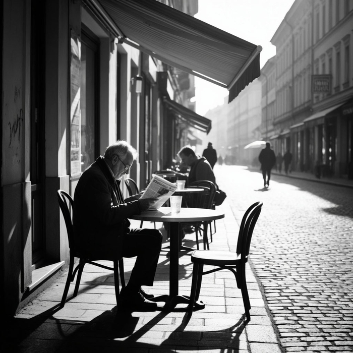 Candid street photography shot. An elderly man reading a newspaper at a small cafe table, morning light filtering through an awning and creating long shadows on the cobblestone street. Leica M6 aesthetic, black and white, fine grain, timeless moment, captured spontaneously.