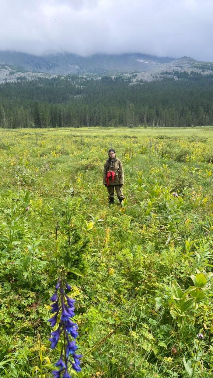 На обратном пути мне удалось заехать к охотоведу, который проживал в предгорьях Западных Саян. Так что я побывала ещё и в глухой Сибирской тайге. На фото кстати не просто красивая полянка, прямо у меня за спиной большое топкое болото. А сама я уже увязла в грязи почти по колено.