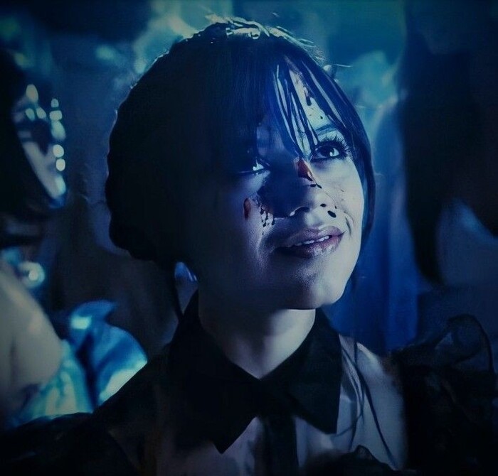 При этом Уэнсдэй знает кунг-фу и ей ничего не стоит избить троих парней выше нее ростом. А как она танцует, как она танцует, все эти резкие переходящие в плавные движения рук и не моргающий взгляд.