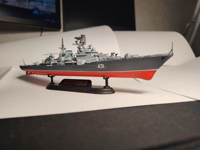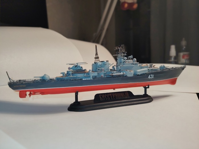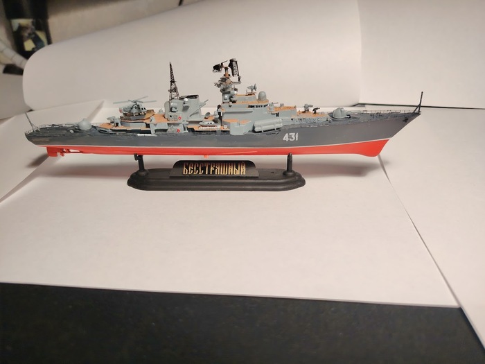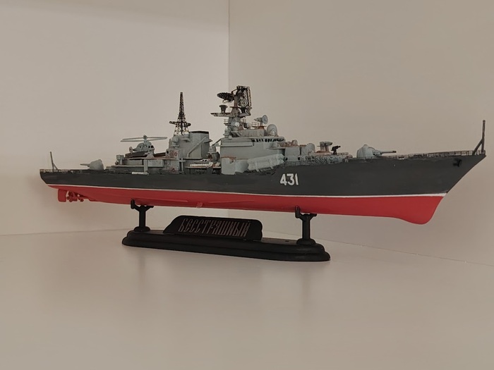 Я собрал его несколько лет назад, наклеил бортовой номер 431 (который был в декалях), добавил антенны как у "Безупречного", а на подставку вывел название "Бесстрашный" (оно тоже было в коробке). Получился такой собирательный образ советской морской мощи конца Холодной войны.