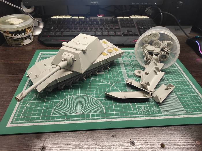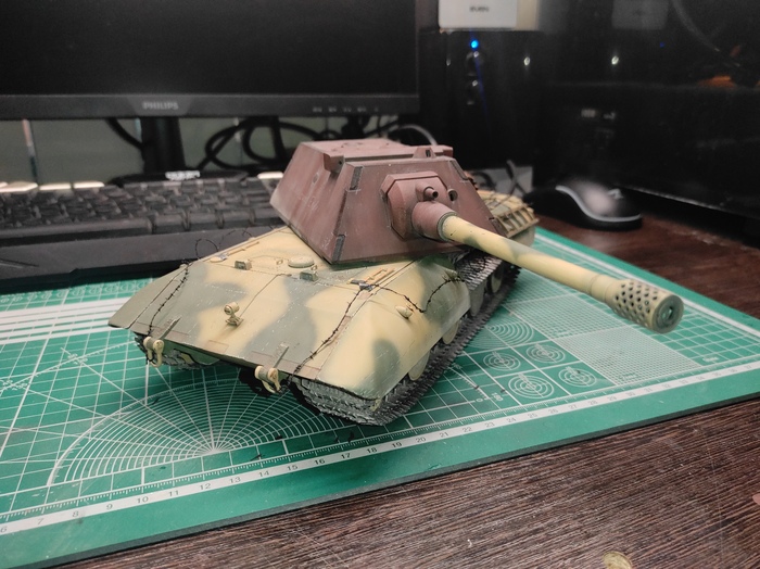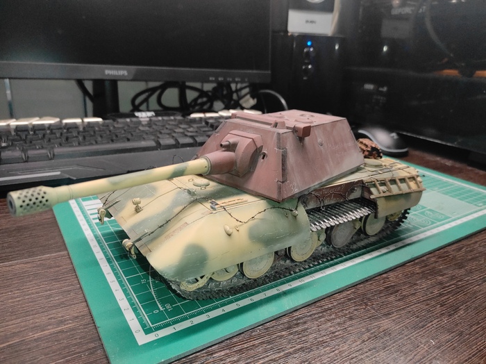На этот раз модель от фирмы Trumpeter. Тяжёлый немецкий танк Е-100. Данный танк в реальности не существовал, в отличии от Мауса, немцы успели сделать только корпус. В сборке особых сложностей не возникло, детали нормально стыкуются и склеиваются. По качеству примерно также как и свежая Звезда, только комплектация странноватая на мой взгляд. Деталей остекления нет вообще, смотровые приборы даны просто пластиком, зато есть фототравленые детали.