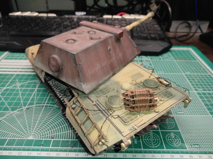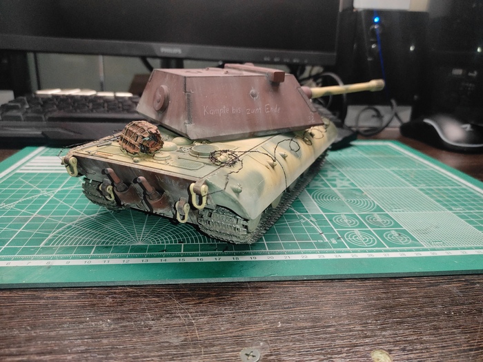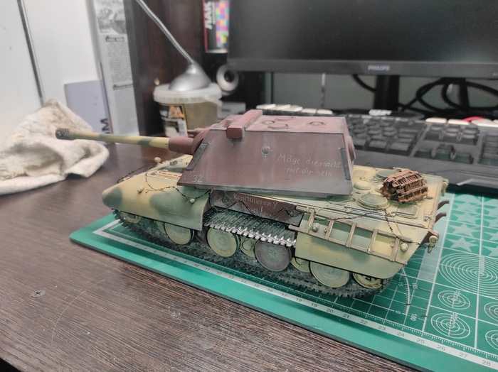 Вариант окраски я выбрал вдохновившись фотографиями других работ. Танк как бы окрасить весь не упели, как собрали так и в бой прямиком из цеха. Корпус в камуфляже, и то не весь, башня так и осталась только в грунтовке, с остатками разметки. Сделал разные надписи, сделанные то ли сборщиками то ли уже экипажем. Камуфляж наносил от руки, без использования масок и тоже впервые.