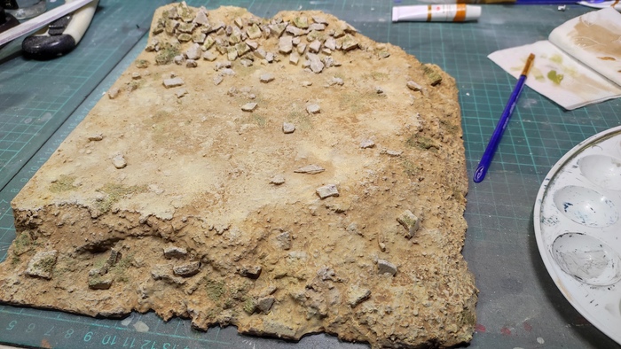 Взял какой-то песочно-коричневый цвет, который тоже не жалко, и началось интересное. Следим за руками: надо наносить краску (аэрографом, если чо) строго под определенным углом к выступающим частям поверхности. Где край "оврага" - дул так, чтобы теневые части остались темно-коричневыми; на камни дул строго сверху, а саму площадку дул под очень острым углом к поверхности - так, чтобы все выпуклости посветлели, а впуклости не отсвечивали. Казалось бы, можно где-то тут и заканчивать. Насыпать пыли, добавить пару акцентов и пойдёт... Но хрен там плавал! Цвет вообще не бьётся с тем, что налипло на основную модель. Мне не хватает жёлтого а значит...