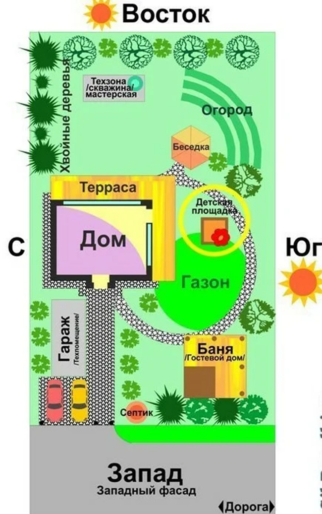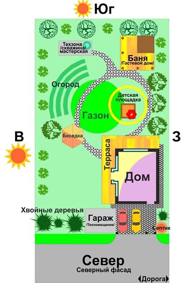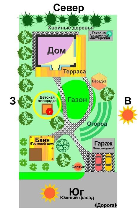 Пример распределения строений и зон, исходя из расположения участка по сторонам света, можете видеть ниже. У Вас, в итоге, должно получиться нечто подобное.