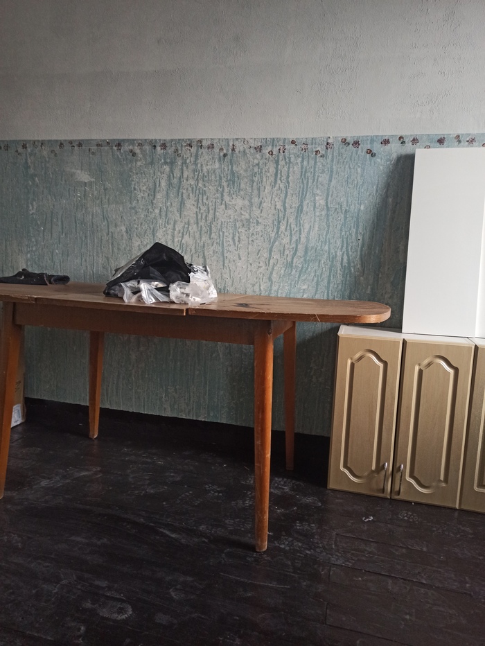 И на разборки остался кухонный гарнитур, но сначала я сняла пластик в санузле, чтобы посмотреть, как стояки все идут вниз. В полу все стояки были щедро замазаны бетоном, но из стены санузла в сторону кухни была дырень, посветив в которую, я увидела обратную сторону кухонного гарнитура и подводку кухонной раковины, а вверх уходила загадочная темнота. Внизу в этой дырени лежали обломки бетона и разводной ржавый ключ, это почти метр пространства между кухней и санузлом. Мне все это не понравилось, я взяла сначала обрезки ламината, думая вырезать и закрыть дырень. Но поприкладывав ламинат, поняла, что вырезать из него под размер вертикально идущих от санузла в кухню труб (канализация, холодная и горячая вода) я не смогу.