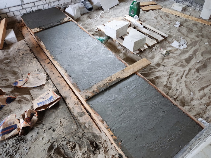 Понедельник. Начнем с начала. Газобетонные перегородки нельзя поставить на пол. Вернее можно, если это хороший твердый пол из бетона толщиной 10см или фундаментная плита. Если вы поставите перегородку на стяжку 4см толщиной, под которой утеплитель - есть риск что стяжка лопнет, а перегородка треснет. Можно конечно воспользоваться покупкой проекта дома, где в полу уже будут учтены усиления под перегородки, проследить чтоб их действительно сделали - но это не наш случай. Мы делаем сами, по зову души, а не по сухим проектам каких то умников\ботаников. Ну так вот, нужен фундамент. Помним что перегородка должна нести только себя, а значит вес - без крыши, ветровой и снеговой нагрузки. большой фундамент не нужен.