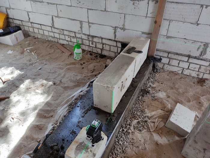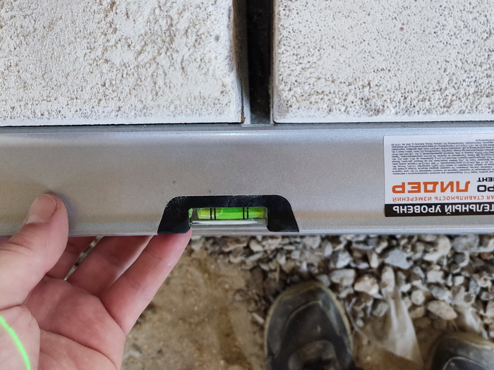 Среда. Теперь нужно выставить первый ряд блоков на гидроизоляцию ровно, тут требуется аккуратность и уровень, у меня лазерный и обычный, для этого используем цементный раствор. Я мешал раствор 1/4/1 на одну часть цемента сыпал 4 части песка и 1 часть воды, это что то около М100, но так как блоки М35, будет достаточно. Блоки сосут воду как губки, поэтому воды напидорил больше чем надо. Выставлял все по лазерному уровню. На стену прикрутил доски так же по уровню, это как направляющие углов и блоки ставил навстречу друг другу. Выставили? Затем заполняем швы раствором и расходимся. Ведь раствор это бетон - только без камней, тоже должен набрать прочность, иначе устанавливая второй ряд и херача киянкой, которую тоже надо купить - есть риск что раствор треснет и все пойдет по одному месту. Вот прошёл еще один день, а стены все нету...