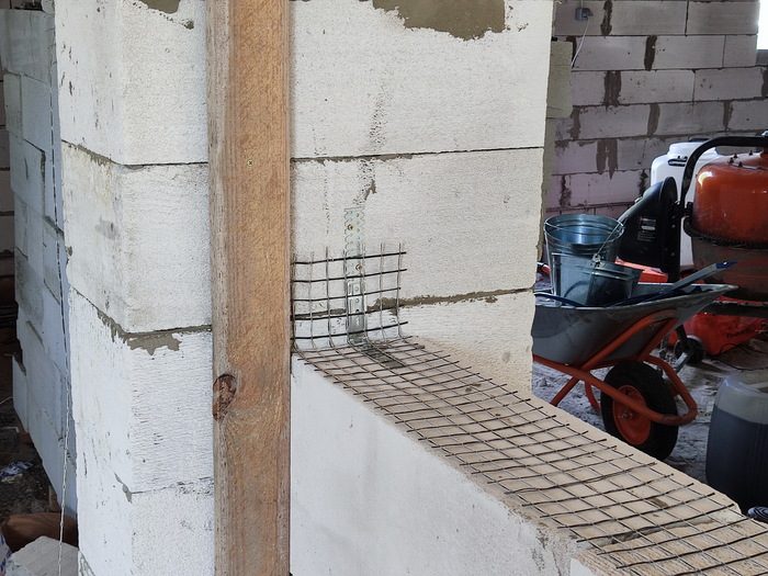 Вот вы и выложили три ряда блоков, поздравляю, время идет к темноте, высота стены метр двадцать, руки устали. Пришло время армировать кладку и связываться со стенами. Я делал как смог, и для связи использовал "штучки для гипсокартона" называется эта хреновина - подвес прямой. Неправильно? Да, но я видел так делали проф.строители на ютубе, так что пойдет. Для армирования я использовал базальтовую сетку. Почему ее? Она осталась от постройки стен, вы можете использовать арматуру в штробы или кладочную сетку из металла. На этом пожалуй и закончится день, так как замешанный клей у вас или закончился или умер. А новый замешивать жалко.