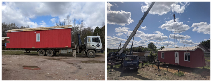 Данный процесс мог бы заслуживать отдельного поста, потому что после транспортировки дома внезапно оказалось, что подвезти его к нашему участку невозможно, не говоря уже об установке. И пока наш дом месяц стоял на остановке, я прорабатывал кучу вариантов, вплоть до грузовых вертолетов, но к счастью нашлось более простое решение.