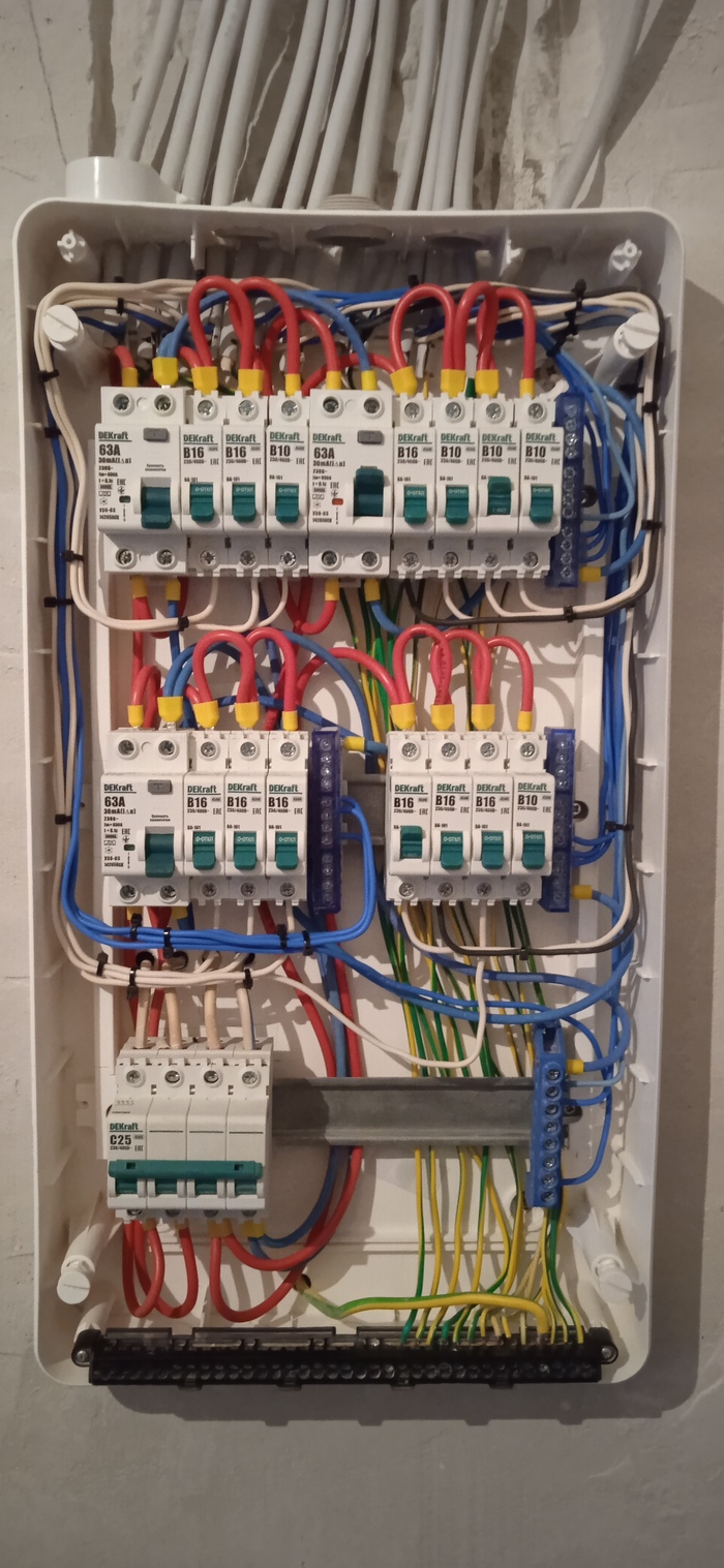Щиток собран на Dekraft-е, вводной 4-х полюсной автомат, С25, УЗО на каждую фазу, автоматы B16 на розетки и B10 на освещение. Шины нулевые Tekfor.