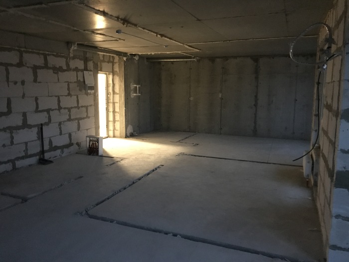 Дальше приступили к установке дверей (они скрытого монтажа, поэтому их нужно было поставить до работ со стенами), подготовке стен под покраску, сборке гипсокартонного потолка и заливке пола под паркет в спальнях: