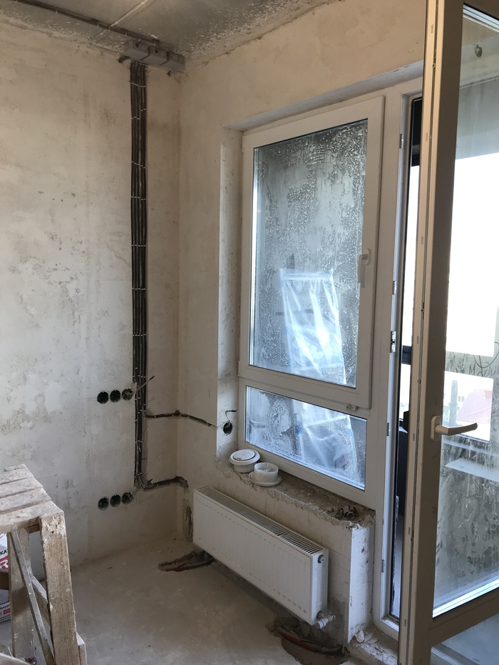 Далее, возвели новые стены, перенесли шкаф с гребенками отопления, сделали разводку электрики и сантехники, перенесли выводы к батареям с пола на стены, сделали выводы под сплит-системы (от застройщика они хоть и были, но в неудачных местах) и бризеры: