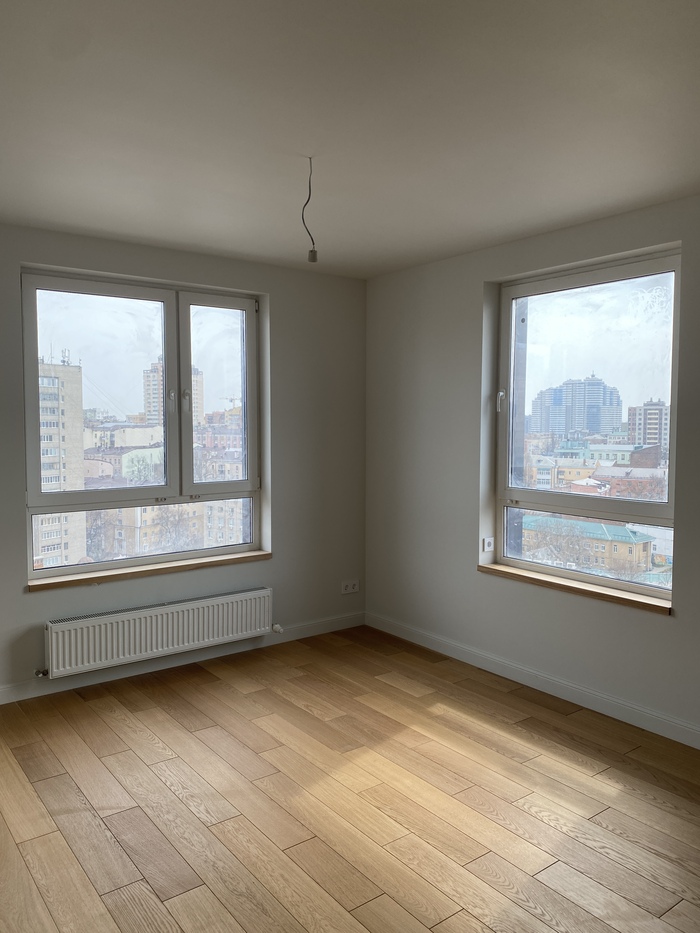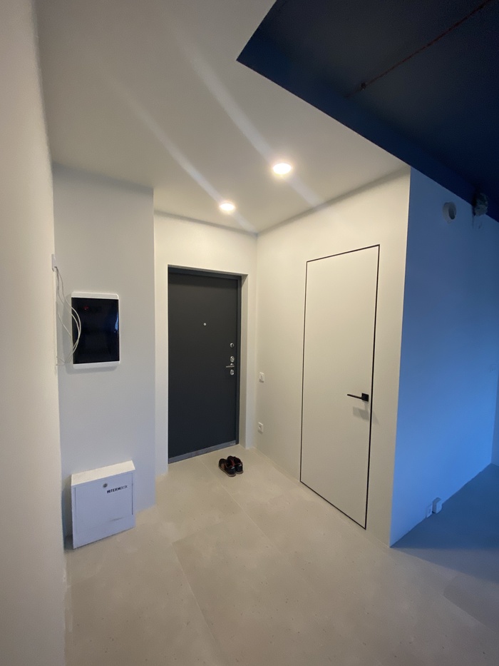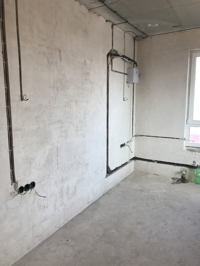 С установленными плинтусами и финишной покраской, а также частично установленной электрикой: