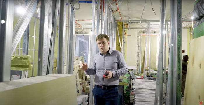 Возьмем для примера один из объектов, где сейчас выполняется ремонт, в частности, ведутся активные работы по звукоизоляции стен, перегородок, потолков. Ремонт ведется в новостройке, поэтому в демонтаже перекрытий, конструкций нет необходимости.