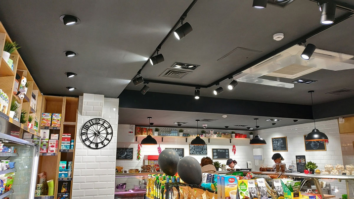 3. Комбинированное освещение. Это смесь первого и второго вида. Из его плюсов – позволяет избежать резких контрастов между товаром и окружением. Отмечу такой момент, что для этого и предыдущего пункта нужно настраивать светильники. Иначе будет как на фото ниже, когда трековые светильники (в левой трети фото) светят больше на стену, чем на товар: