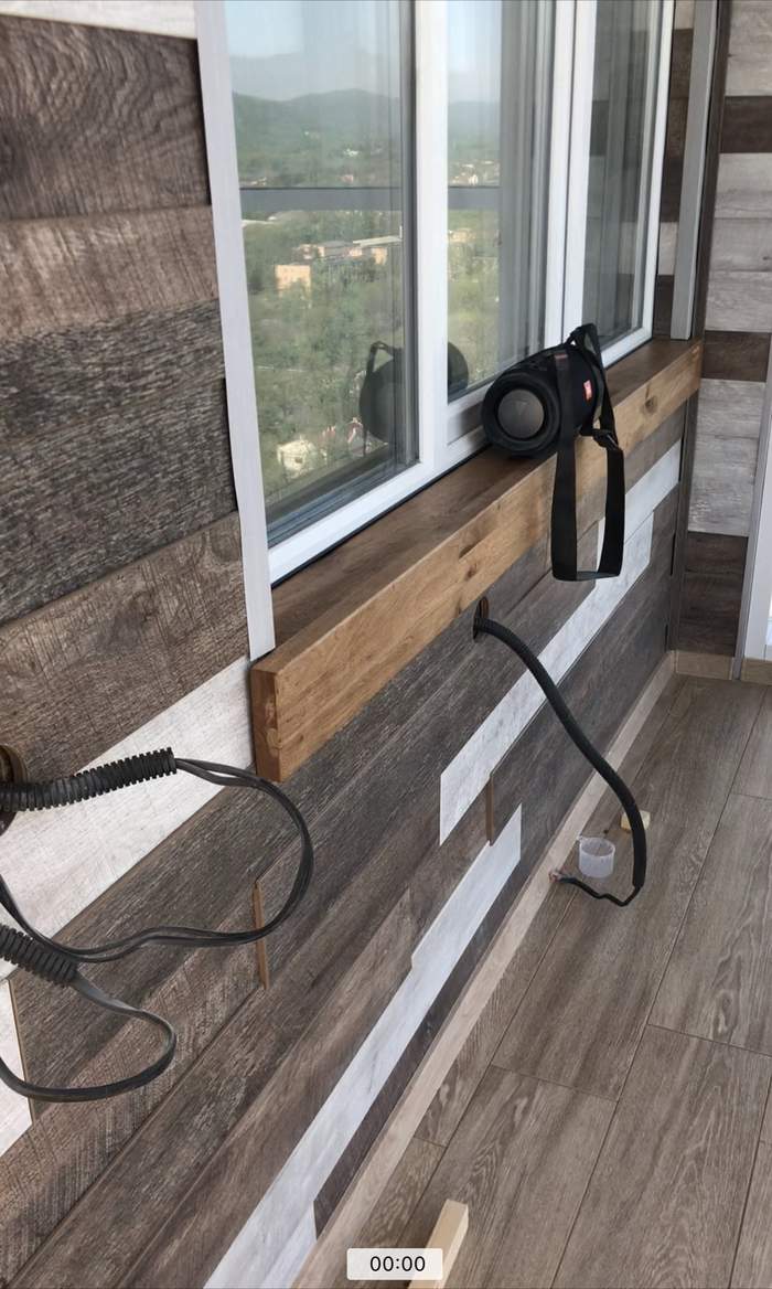 А это другая сторона балкона. Боковушку уже зашил, поставил плинтуса, сделал подоконник. Обычный не подходил - изначально подоконник втыкается под оконную раму, и у них у всех стандартной высоты свес передний. А мне нужно было его приставить к оконной раме, чтобы скрыть дефекты на ней - строители металлопрофиль под гвл крепили прям к ней, она вся в дырах от саморезов была. Но в этом случае высоты передней стенки пластикового подоконника не хватало, чтобы он нависал над стеной. Я плюнул, напилил дуба, склеил два узких щита, а из них уже сделал такую штуку. К оконной раме привинтил алюминевый уголок анодированный, черный, и под него посадил на пену подоконник.