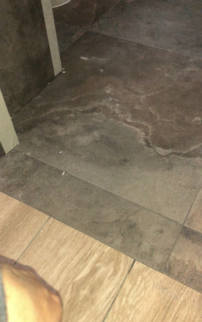 Стык проходит под дверью, уровень пола в ванной ниже на 7 миллиметров чем в зале. Эта узкая полоска гранита как раз лежит на перепаде высоты. Перепад высот на случай протечек - в ванной датчик аквасторожа, если он намокнет, система рубит воду. Благодаря перепаду - если в ванной вылить на пол примерно полведра воды, она как раз распределится слоем в пару мм по полу, и гарантированно намочит датчик. Ну а в зал вода не дойдёт, никакая мебель в квартире не пострадает.