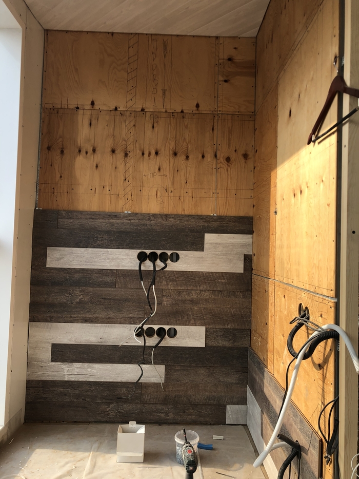 Занялся стенами. Нашел прикольные стеновые панели kronoWall. Как ламинат, только паз на всех сторонах немного другой, за счёт этого и при помощи специальных кляймеров для них можно эти панели не в одной плоскости размещать, а в разных. Получается очень прикольная объёмная структура.