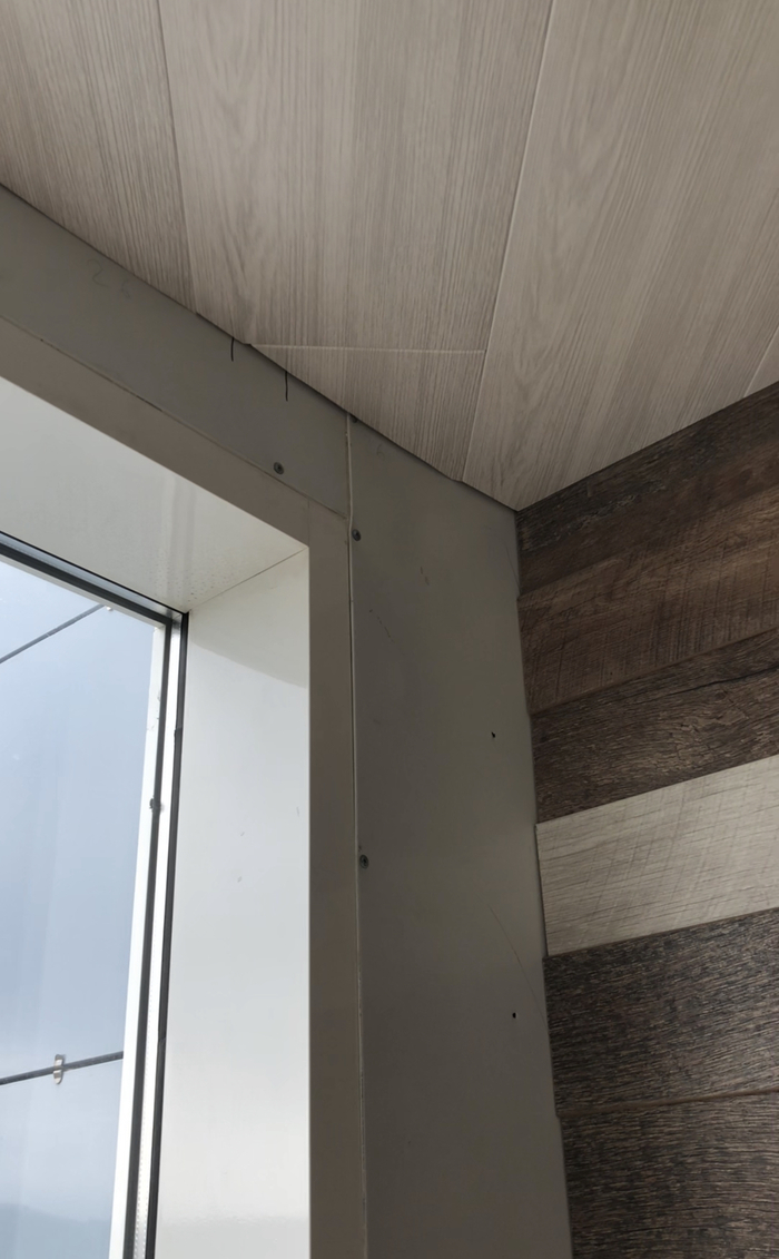 Сами ламинатины тоже клевые, рельефные, имитация досок прям 100%. На фотке кстати, видно оконную стенку, белую. Застройщик к ней чёрными саморезами прикрутил жестяной профиль белый, и сбоку окон, и снизу, и сверху. За ним лежит утеплитель. Снизу эту страшную жестянку я снял, когда пол делал. Сверху и сбоку оставил, но теперь пришлось как то ее маскировать. Пришлось набивать ламинат и на боковую стенку, и пускать линию ламината под потолком вдоль окон, чтоб все это скрыть.
