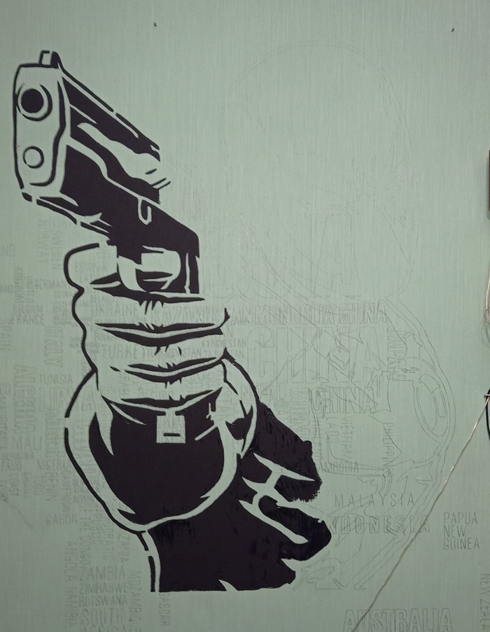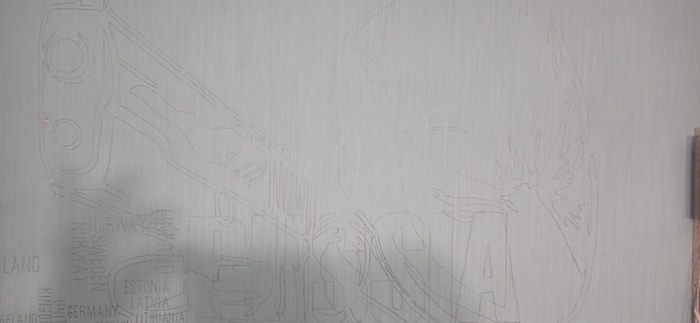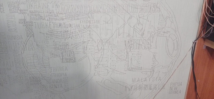 Обои фризелиновые, предназначены под покраску. Изначально на стене присутствовали следы предыдущего неудачного опыта. Мне хотелось изобразить карту мира в виде текстовых названий в масштабе, но я это дело забросил, так как охладел к этой затее, соответственно вот так выглядел мой "холст":