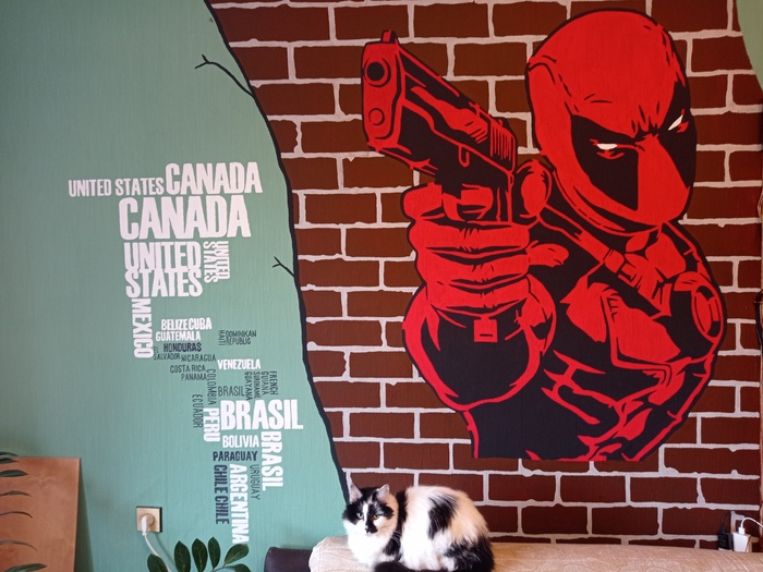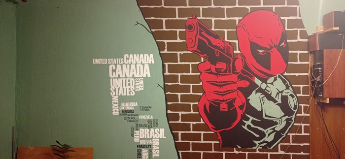 Выглядит неплохо и в таком виде, на мой взгляд, если бы это было на чистой стене. Но предыдущие недоделки заставили меня идти дальше. Было решено на фоне сделать что-то вроде взрыва, а самого мистера Хренубьёшьмэна раскрасить в классический красный. Начать я решил с красного, алый колер в наличии, что могло пойти не так? А то, что алый колер я решил разбавить не чистой белой краской, а уже немного смешанной с черным колером (хотелось получить чуть более темный цвет костюма). Как итог я запорол эту смесь и получил невнятно-коричневый цвет (ниже будет понятно, почему). Но, я решил не отчаиваться и изменить план насчет заднего фона, и именно сменить его со взрыва на кирпичную стенку. Если кто-то решит подобное изобразить у себя, то вот небольшой совет: не спешите. Разведя нужный вам цвет покрасьте малый участок и дайте ему высохнуть, цвет на высохшей стене может отличаться от цвета в баночке с краской кардинально. А мы идём дальше, итак, кирпичный фон: