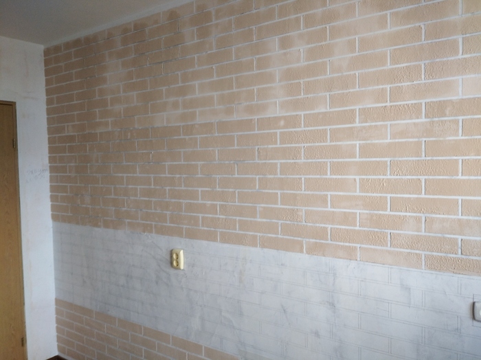 Для отделки стены "под кирпич" после просмотра того же Ютуба также остановились на гипсовой штукатурке. Было перебрано множество вариантов формирования рельефа кирпича, но остановились на нанесении малярной ленты на предварительно размеченную стену.