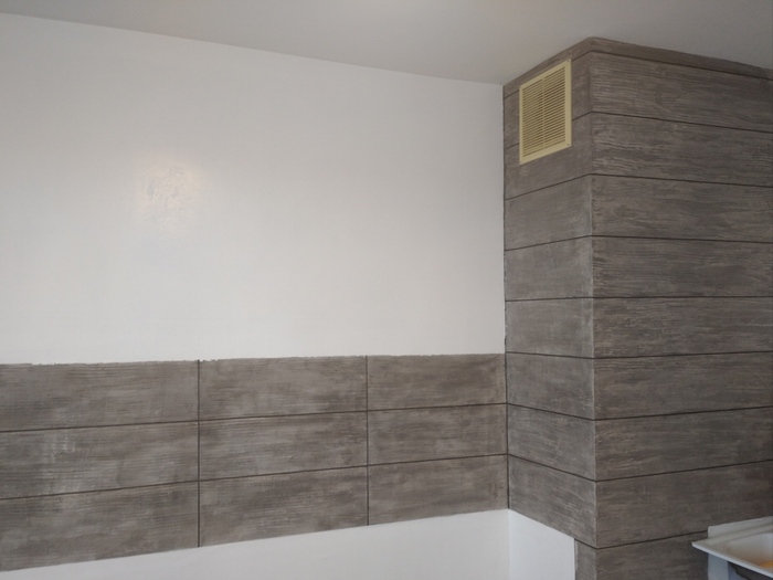 Вот что получилось. Использовали гипсовую шпатлевку, рельеф делали обычной бытовой пластиковой щеткой, швы "под плитку" - прорезывали по влажной шпатлевке плоской отверткой по уровню, красили грунтовкой с добавлением черного колера, швы - просто черным колером.