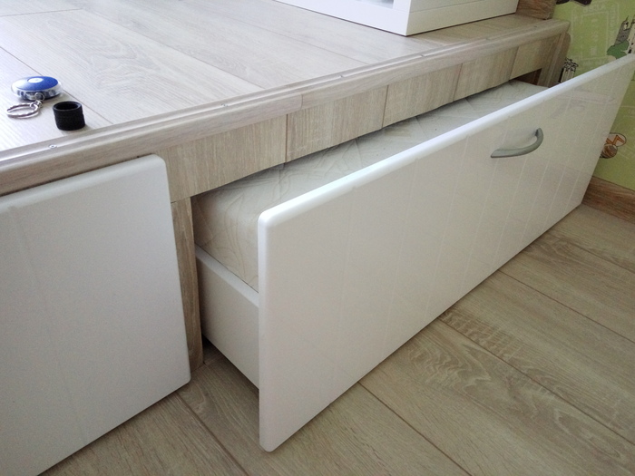 Фасады для кроватей и ящика для белья (МДФ) были заказаны по размерам в кухонной конторе.