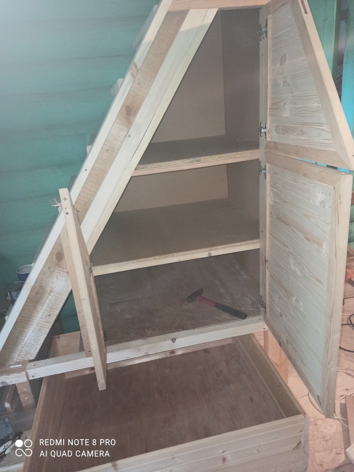 Дико сочувствую автору,ибо хоть и с опытом сам,прекрасно знаю,как это-- вымерять все правильные и неправильные углы в условиях подлестнечного пространства и не совсем правильного геометрически деревенского дома))Так же,как и в посте,было решено сколотить под лестницей что-то с дверками,полками и шуфлядкой.Учитывая,что всё,кроме вагонки и фурнитуры,делалось на фабрике "Возьми из той кучи",дело заняло 2 недели времени.)В итоге вышло следующее: