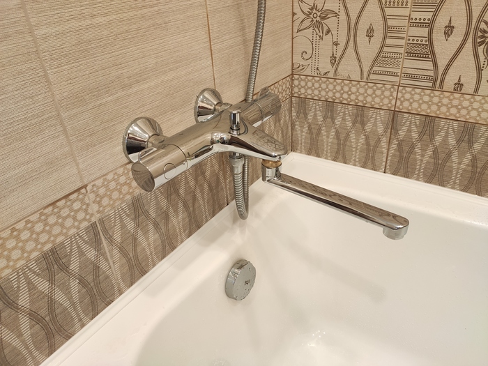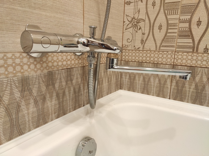 Осталось найти переходник из нержавейки или хромированный. И придумать как сделать ограничение на поворот больше +/-90° от прямого положения, чтоб на борт ванны не лить воду. Может кто-нить чего придумает?
