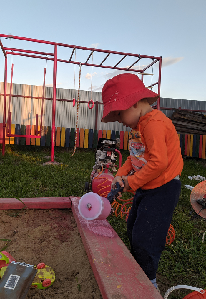 Ну и помимо работ внутри помещения, конечно же делались и на участке. Сын уже большой, одной песочницы ему мало. Заказчик просит-надо делать. И снова остатки каких-то труб, немного времени и сил и получается что-то с чем-то. Отец сделал, заказчик пусть сам красит. Покрасил. Заодно и песочницу свою обновил.