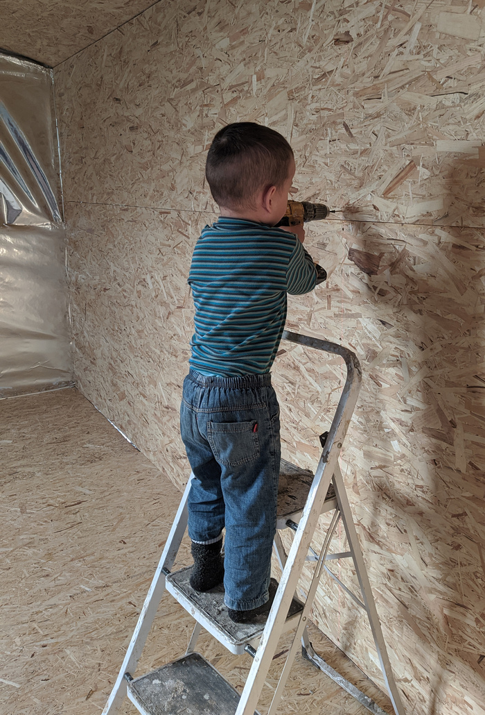 Игры играми, а я начинаю осознавать, что мне категорически не обойтись без гаража, мастерской, кладовки. Называть можно как угодно, главное, что оно мне нужно сейчас. А раз нужно, надо делать. И конечно же мы тут же приступили к работе. Пряник и Печка всё так же поучают, но уже сына, меня, бестолкового, они так научить и не смогли. Пару недель работы и вот такой результат. И снова ничего сложного, поскольку технология крайне легкая, да и опыт уже имеется.