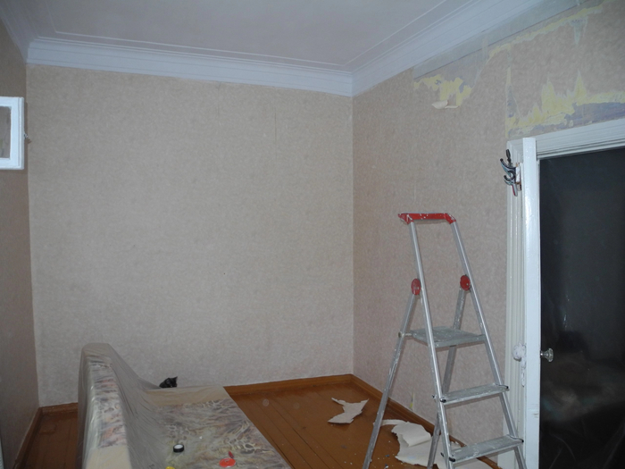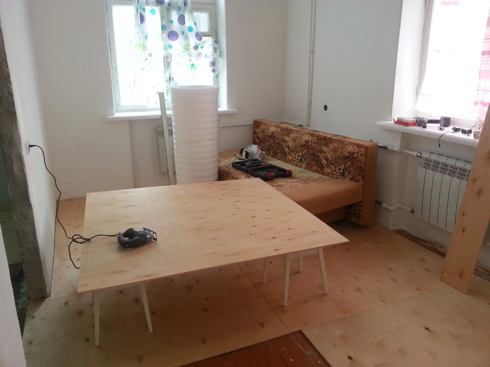Так как затевалось это как бюджетный капремонт, пол не перебирался, просто кинул фанеру. И уже побелил перед поклейкой обоев. Вроде всё.
