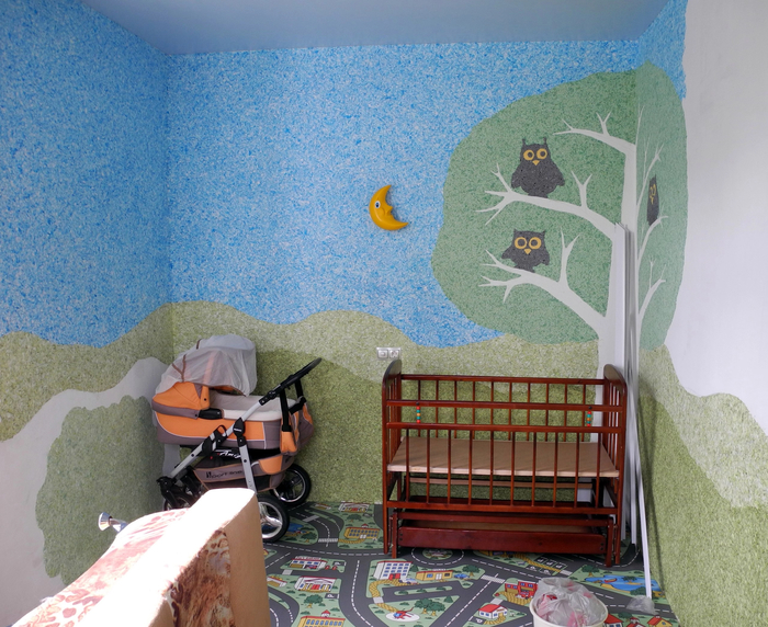 Для ЛЛ результат в начале. Мы довольны. Сочно. Нам нравится. Стены лучше гасят детский рев. Мягче биться головой о стены. Правда кот считает это помещение своей гигантской когтеточкой, но восстановить обои можно поплевав (из пульверизатора) и разгладив рукой (или шпателем).