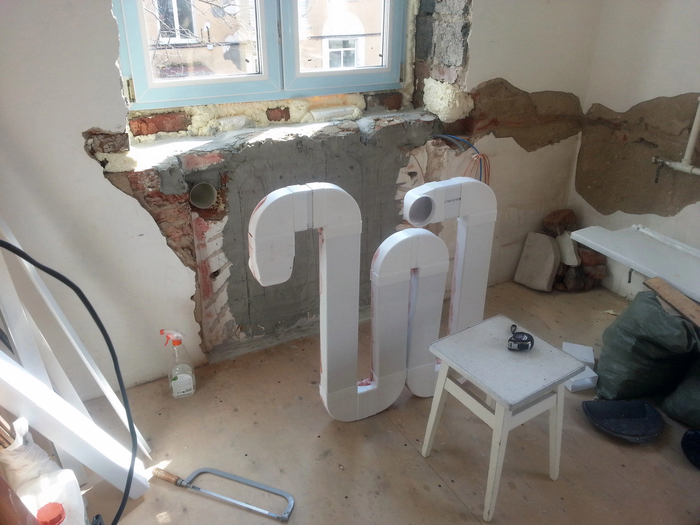 Опять же, сначала было на стене нарисовано где крепится батарея, границы бытареи, потом сделан змеевик и проделан канал под него. Змеевик склеивается моментом, чтобы удобнее было вмазывать.