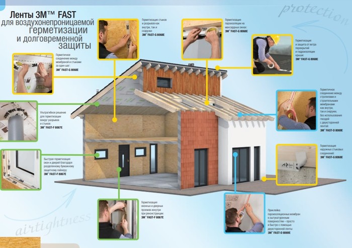 Итак, есть у компании 3М отельное семейство одно- и двухсторонних скотчей под названием Fast. Создано оно специально для тамашних строителей каркасных домов. В семейство входят 8067Е односторонняя с защитным лайнером для пароизоляции и герметизации (слева), 8068 односторонняя армированная для пароизоляции (в центре) и 8069 двухсторонняя для монтажа мембран на стены и потолок (справа). Вот они на фото:
